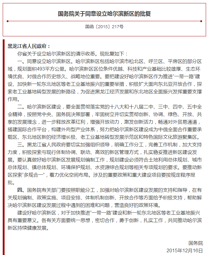 國務院關于同意設立哈爾濱新區(qū)的批復